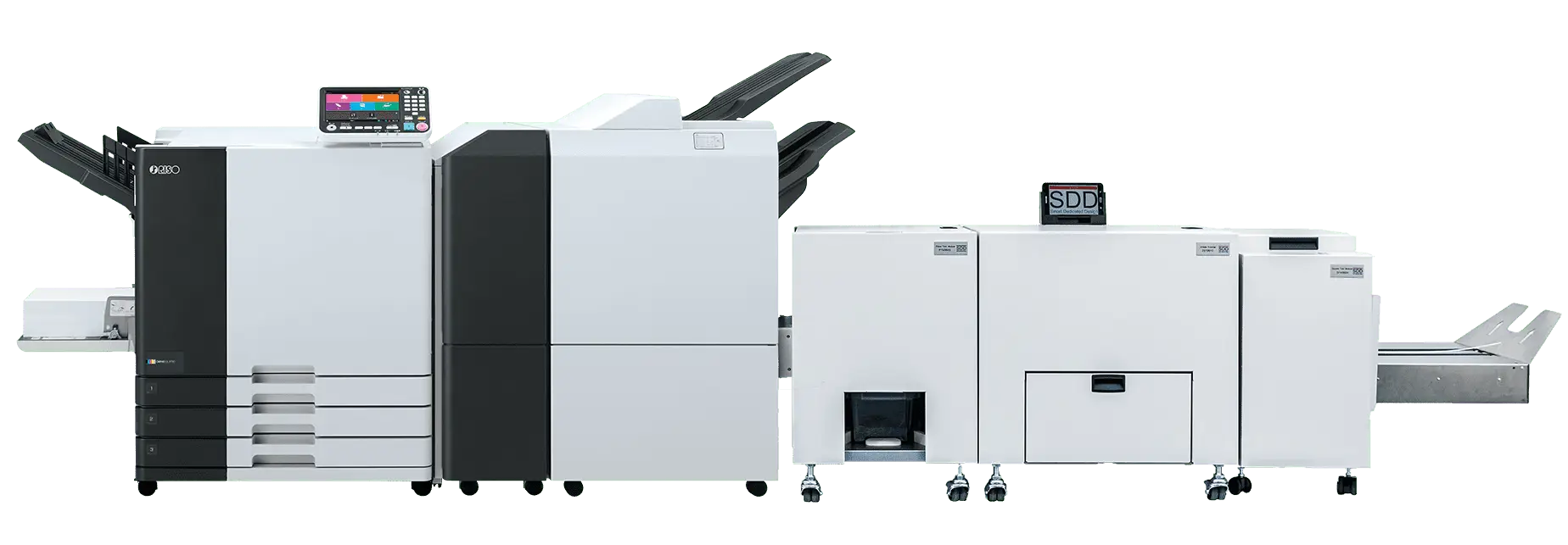 - Podajniki papieru o dużej pojemności i moduł odbioru wysokiego stosu (stacker)
